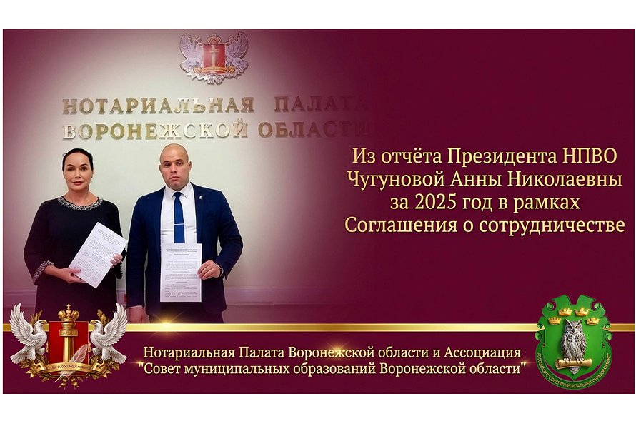31 октября 2024 года было подписано Соглашение о сотрудничестве между Нотариальной палатой Воронежской области и Ассоциацией «Совет муниципальных образований Воронежской области». Основной целью данного документа стало совместное обеспечение прав граждан и организаций, а также улучшение качества правовой работы обеих сторон Соглашения.