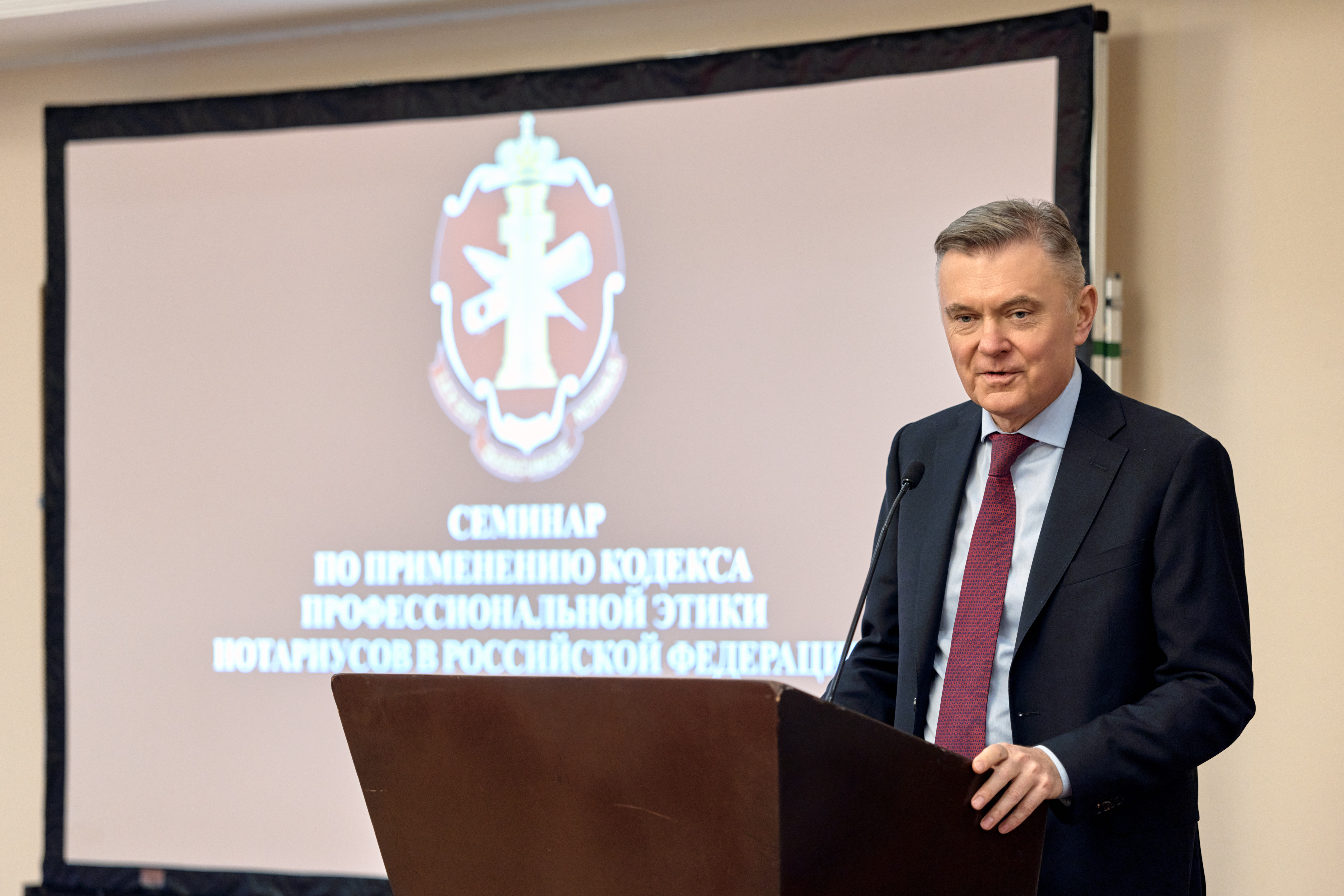 С приветственным словом к участникам семинара обратился президент Федеральной нотариальной палаты Константин Корсик«Вопросы этики играют большую роль для развития института нотариата, для формирования позитивной оценки нашей работы как со стороны государства, так и со стороны общества. Соблюдение единых этических стандартов — это необходимое требование для всех членов нотариального сообщества», — подчеркнул глава российского нотариата.